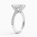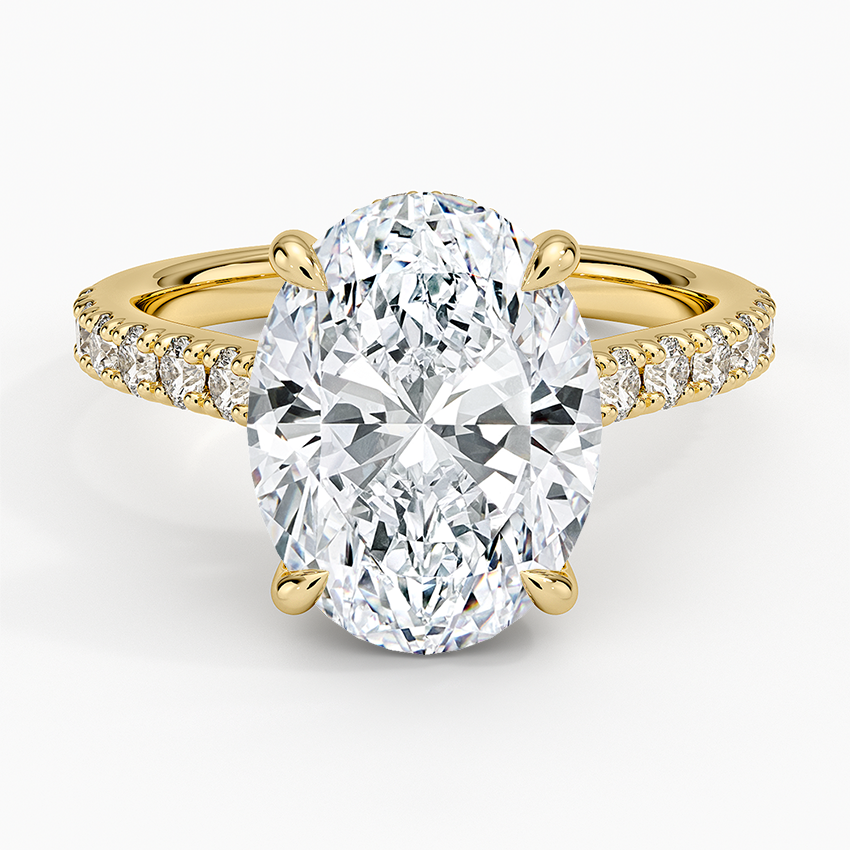 Scalloped pavé diamonds embellish the top of the band and gallery in this classically beautiful engagement ring. The shoulders rise to a cathedral setting and showcase a center gemstone secured by chic claw prongs (1/2 total carat weight).